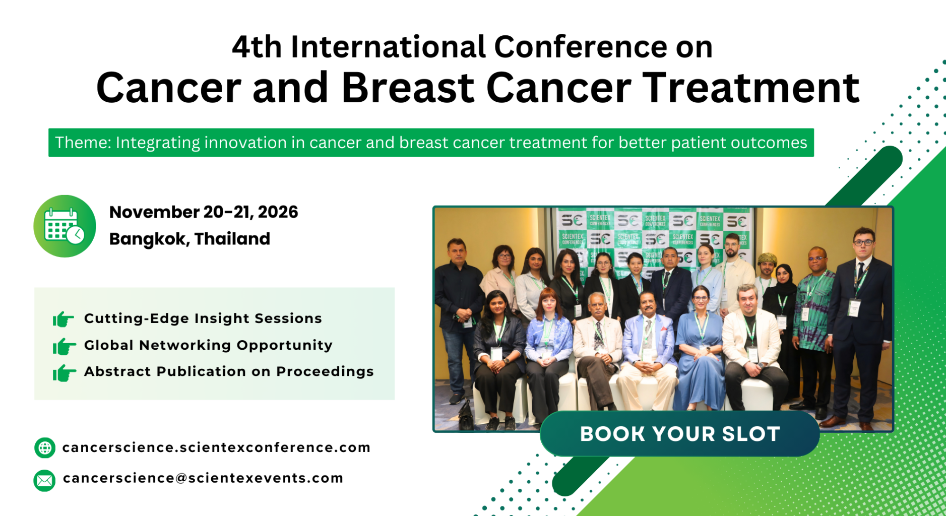 We are excited to invite researchers, therapists, healthcare professionals, and cancer science enthusiasts worldwide to the "4th International Conference on Cancer and Breast Cancer Treatment." Happening on November 20-21, 2026, in Bangkok, Thailand, this forum explores the theme of “Integrating Innovation in Cancer and Breast Cancer Treatment for Better Patient Outcomes” The conference offers various sessions, including keynotes, workshops, posters, video presentations, e-posters, and exhibitor show cases at the Cancer and Breast Cancer Treatment Conference.