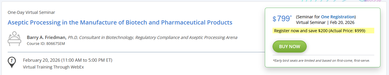 The objective of this live, interactive training seminar is to explore the role of aseptic filling to assure that manufactured product will retain the sterility assurance level prescribed by GMPs. It will review the issues regarding preparing media and setting up the “filtration train”, environmental monitoring, interruptions that may occur during the operation of the Clean Room (planned and unplanned) and the cleaning of the room and its equipment. Equipment used to monitor the equipment and personnel will also be reviewed along with gowning issues that periodically arise. The seminar will also discuss media failures and how to “work through” them. Because of the sensitivity and importance of media fills, this live, interactive training seminar is a MUST for anyone in your organization that is involved in aseptic filling in general and media fills in particular. Please plan to attend this as part of an interactive group project.